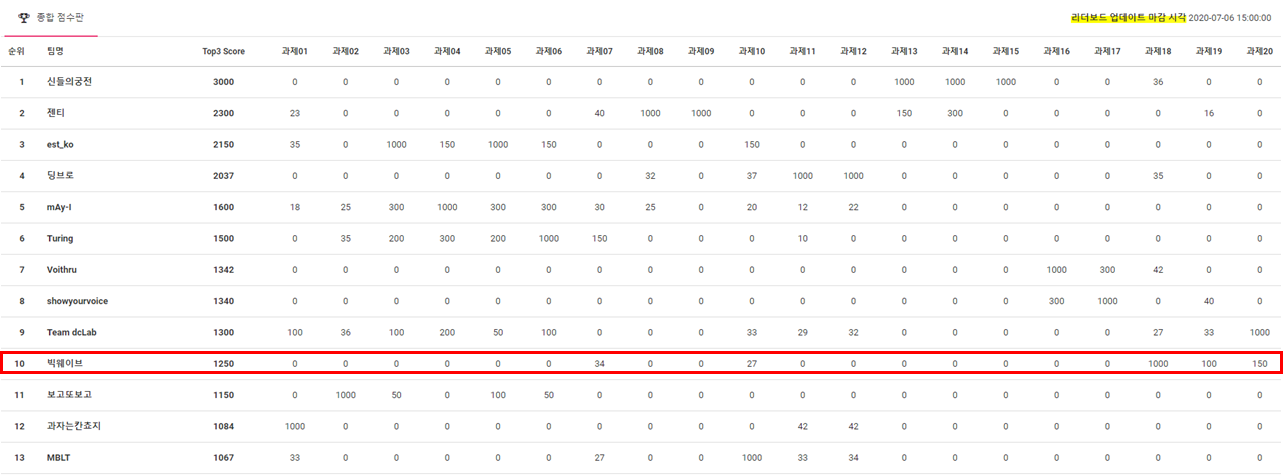 악성 댓글 분류 분야 1위, Proton 예측 분야 6위, 교통량 예측 분야 5위로 400팀 중 종합 순위 10위를 기록했습니다.