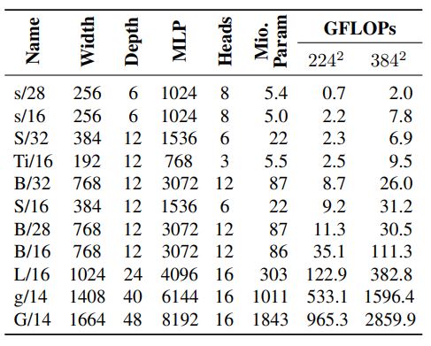 깊이,너비,헤드 및 MLP너비를 변경하지만 패치 크기는 14픽셀로 유지합니다.