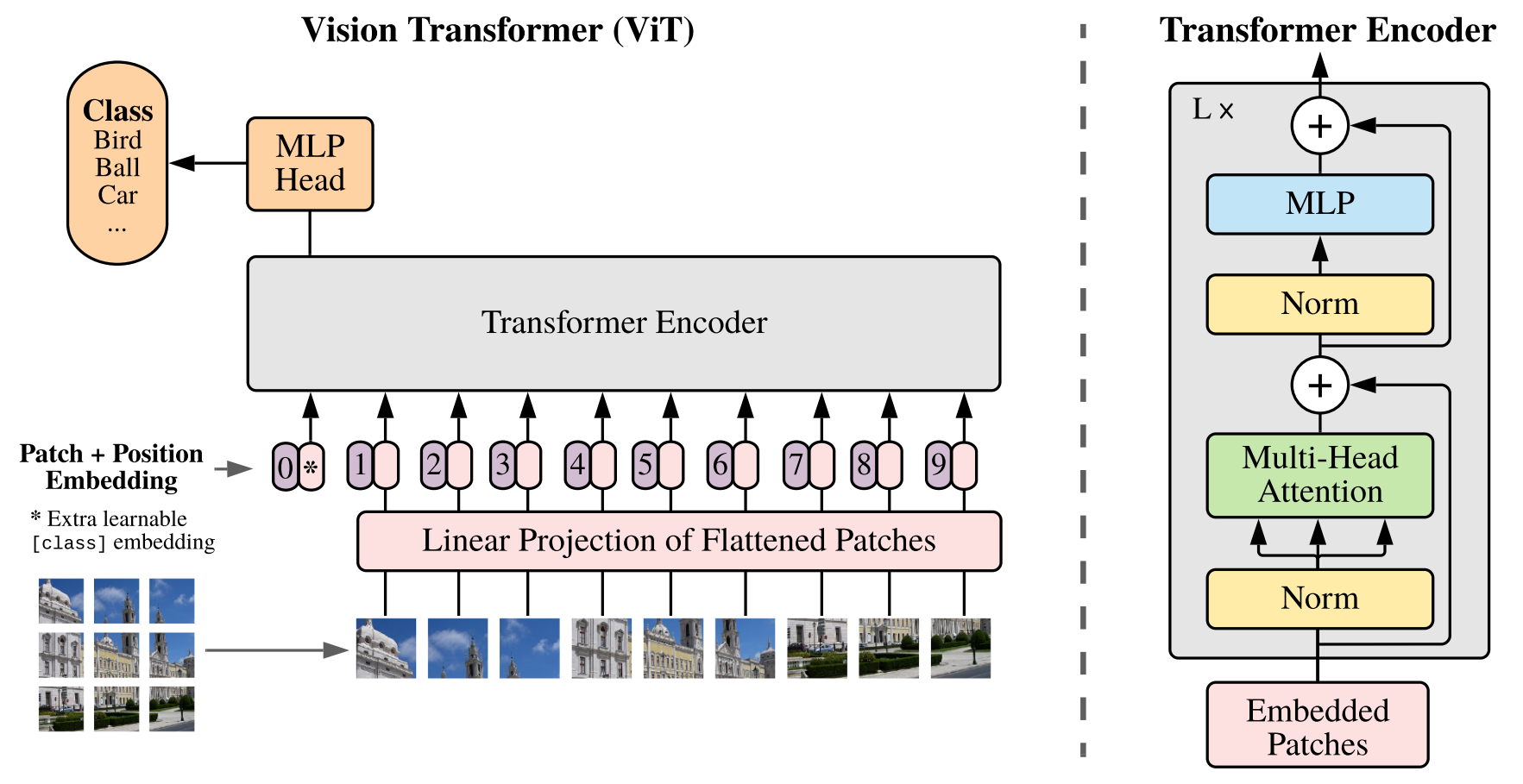 ViT는 이미지를 고정된 사이즈로 분할하여 선형으로 모델에 입력한 후 포지션 임베딩 및 벡터 시퀀스를 모델의 인코더에 입력합니다.