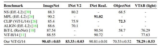 ViT-G/14는 ViT 모델 중 가장 최신의 알고리즘으로써, 기존 SOTA와 비교했을 때 더 뛰어난 성능을 보여주고 있습니다.
