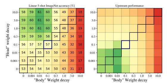 일반적으로 WD는 전체 모델의 가중치에서 적용이 되지만, 본 논문에서는 헤드의 가중치를 따로 WD를 적용했을 때, Few-shot 테스트에서 큰 성능 향상을 관찰했다고 합니다.