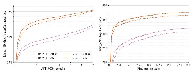 그에 반해, 왼쪽 그림을 보시면 ViT모델은 모델의 규모가 커지지 않아도, 더 큰 데이터 셋에서의 성능이 일관되게 상승하는 것을 보여줍니다.