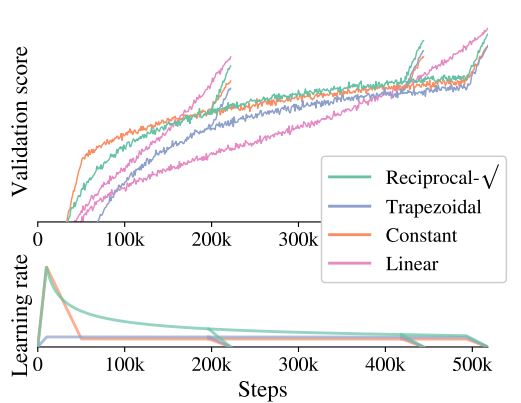 그림(하단)을 보면, 역제곱근(Reciprocal)이 200k, 400k 및 500k 스텝 후 cooldown이 천천히 진행되는 것을 확인 할 수 있습니다.