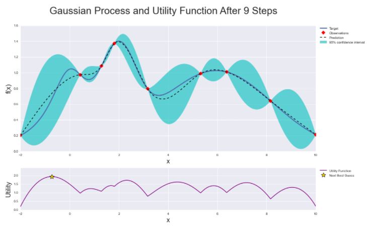 보라색 선은 Acquisition Function으로 다음 입력값으로 어떤 값을 사용할 지 추천하고 있습니다.