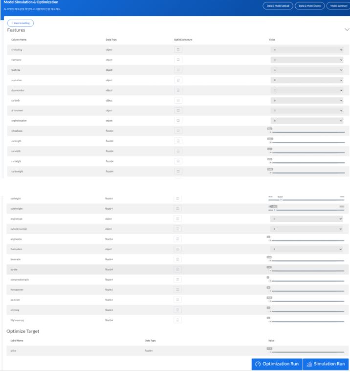 데이터, 라벨 및 모델 파일 선택이 완료된 후 Simulation Board 버튼을 누르면 Simulation & Optimization을 위한 대시보드로 화면이 전환됩니다.