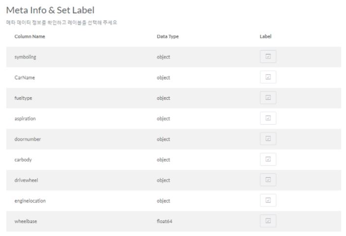 데이터 선택이 완료되면 Check Meta Data & Set Label을 통해 메타 정보를 확인하고, 예측 목표 변수(Label)을 선택합니다.