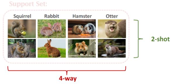 다람쥐, 토끼, 햄스터, 수달의 카테고리가 4개 있고 각각 2장씩 있으면 4-way 2-shot이겠죠?
