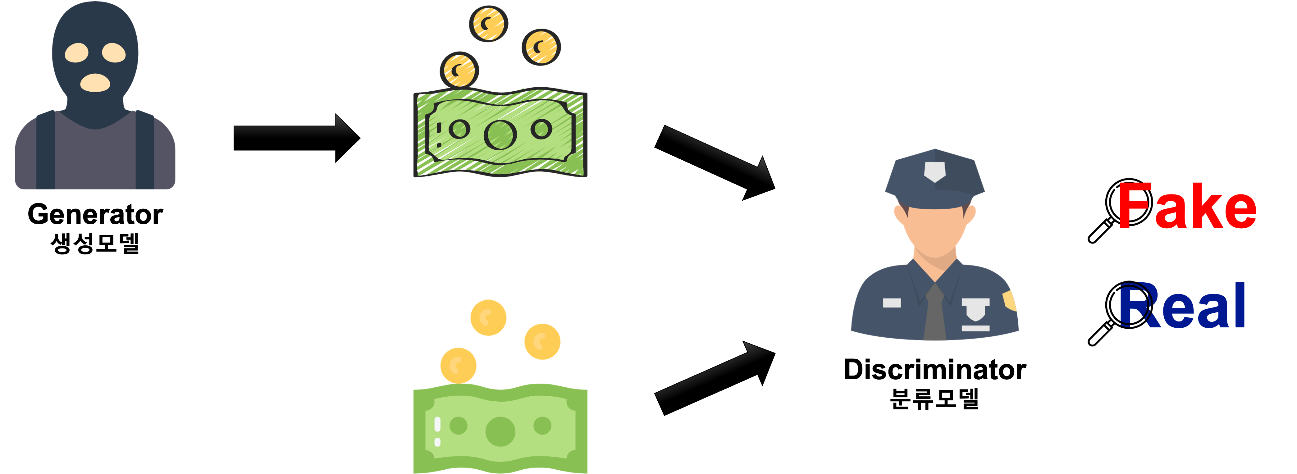 지폐위조범은 계속해서 가짜 지폐를 만들고 경찰관은 이를 판별하는 방식으로 경쟁합니다.