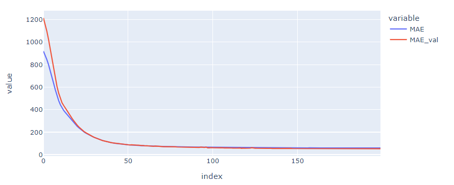 px.line(metrics, y=['MAE', 'MAE_val'], width=800, height=400)