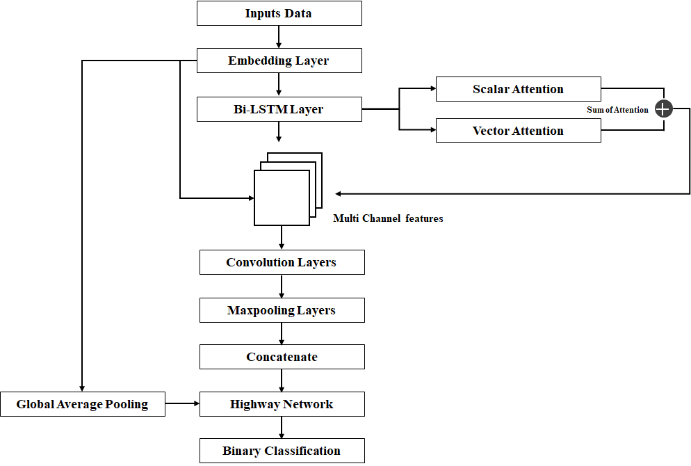 본 모델링 기법은 attention mechanism, BiLSTM(Bidirectional Long Short Term Memory), Kim-CNN, Highway Network 알고리즘이 결합된 형태입니다.