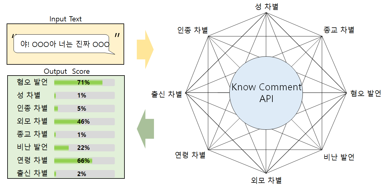 Know Comment API는 딥러닝 기술을 기반으로 차별 및 혐오 표현 탐지가 가능한 시스템입니다.