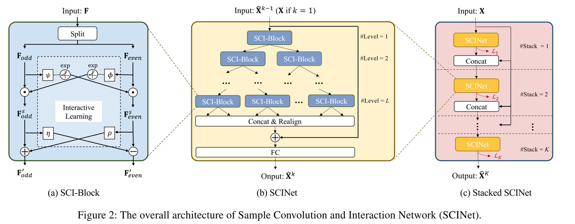 SCINet 모델 구조는 아래의 그림처럼 크게 3가지로 구성됩니다.