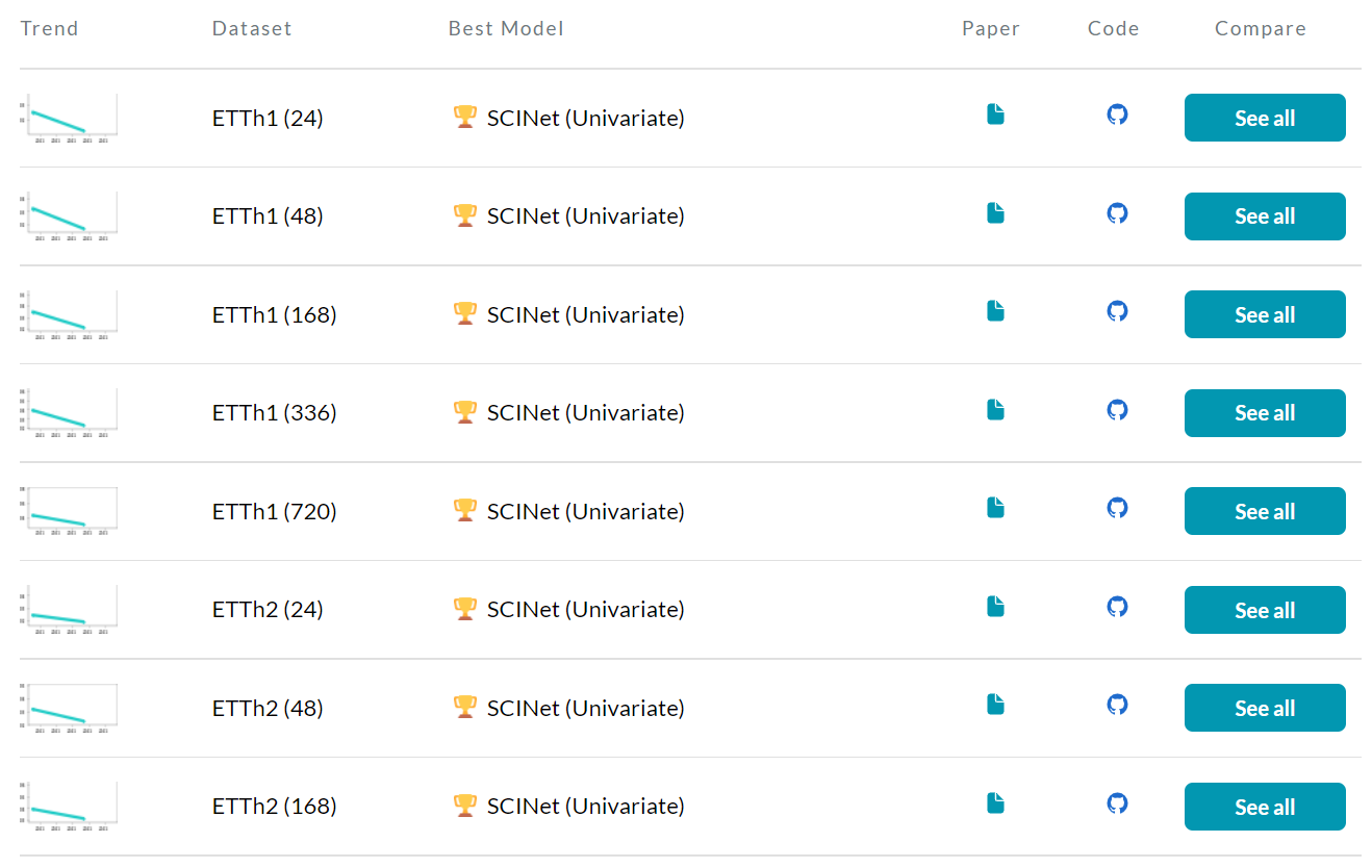 실제로 2022년 3월 기준 SOTA 사이트의 Timeseries Forecasting 부문에 들어가보시면 ETTh2 (720)을 제외하고 9개의 실험결과에서 SCINet의 압도적인 수치가 나타납니다!