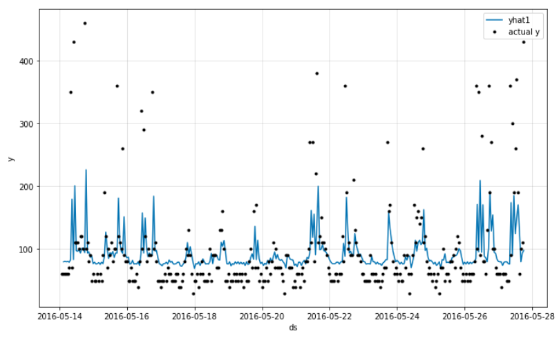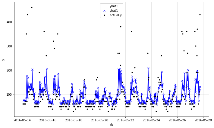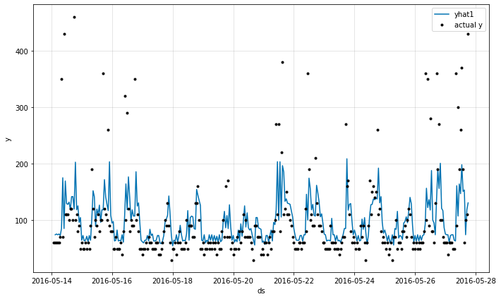 fig = m.plot(forecast[['ds', 'y', 'yhat1']])