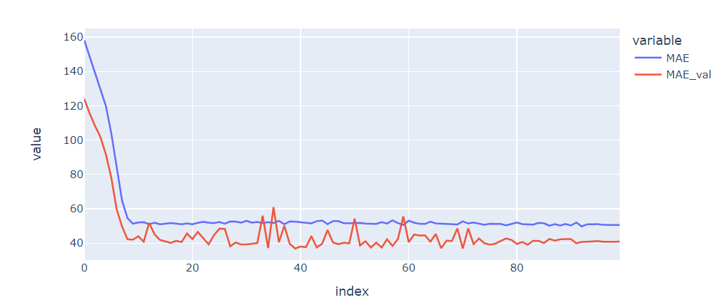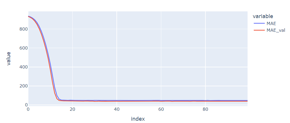 px.line(metrics, y=['MAE', 'MAE_val'], width=800, height=400)