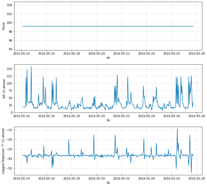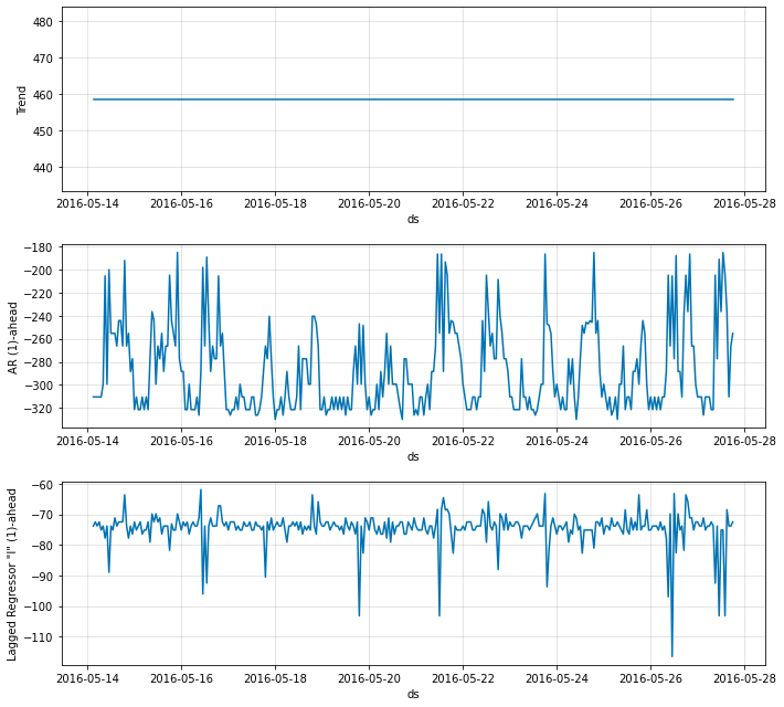 add_lagged_regressor에서는 AR(1) 모형을 설계하므로 y데이터의 lag된 변수 "l"만을 설정합니다.