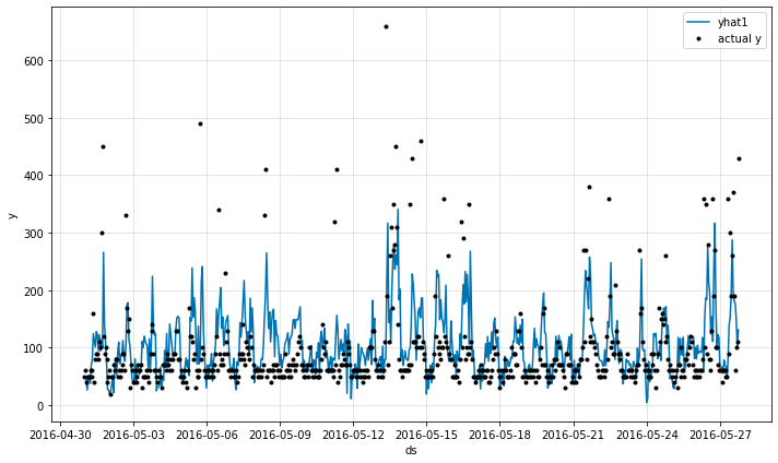 fig = m.plot(forecast[['ds', 'y', 'yhat1']])