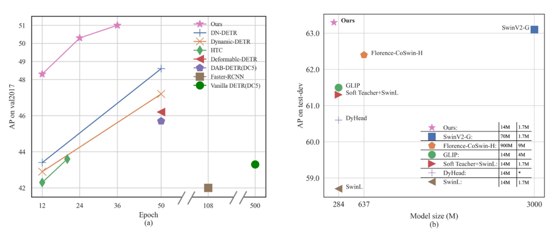 실험에서는 COCO 2017 object detection dataset을 Fine-Tuning 했으며, 백본 모델은 ImageNet-22k SwinL 가중치를 활용했다고 합니다.