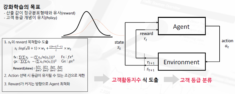 강화학습 알고리즘을 통해 데이터 분포의 왜도와 첨도를 최소화할 수 있는 고객활동지수 식을 산출하여 이를 기반으로 고객 등급을 분류했습니다.
