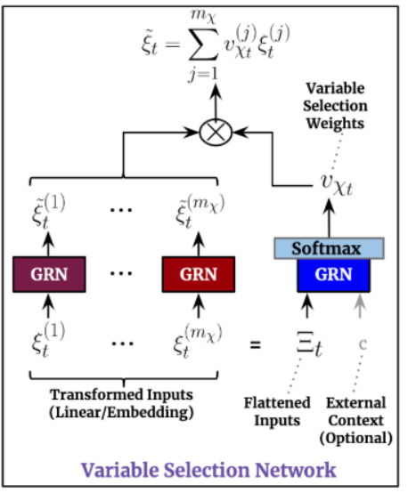변수 선정 네트워크 모델에는 통합된 전체 입력 변수, 외부 context vector를 GRN에 입력 후 Softmax를 통해 변수를 선정(1)합니다.