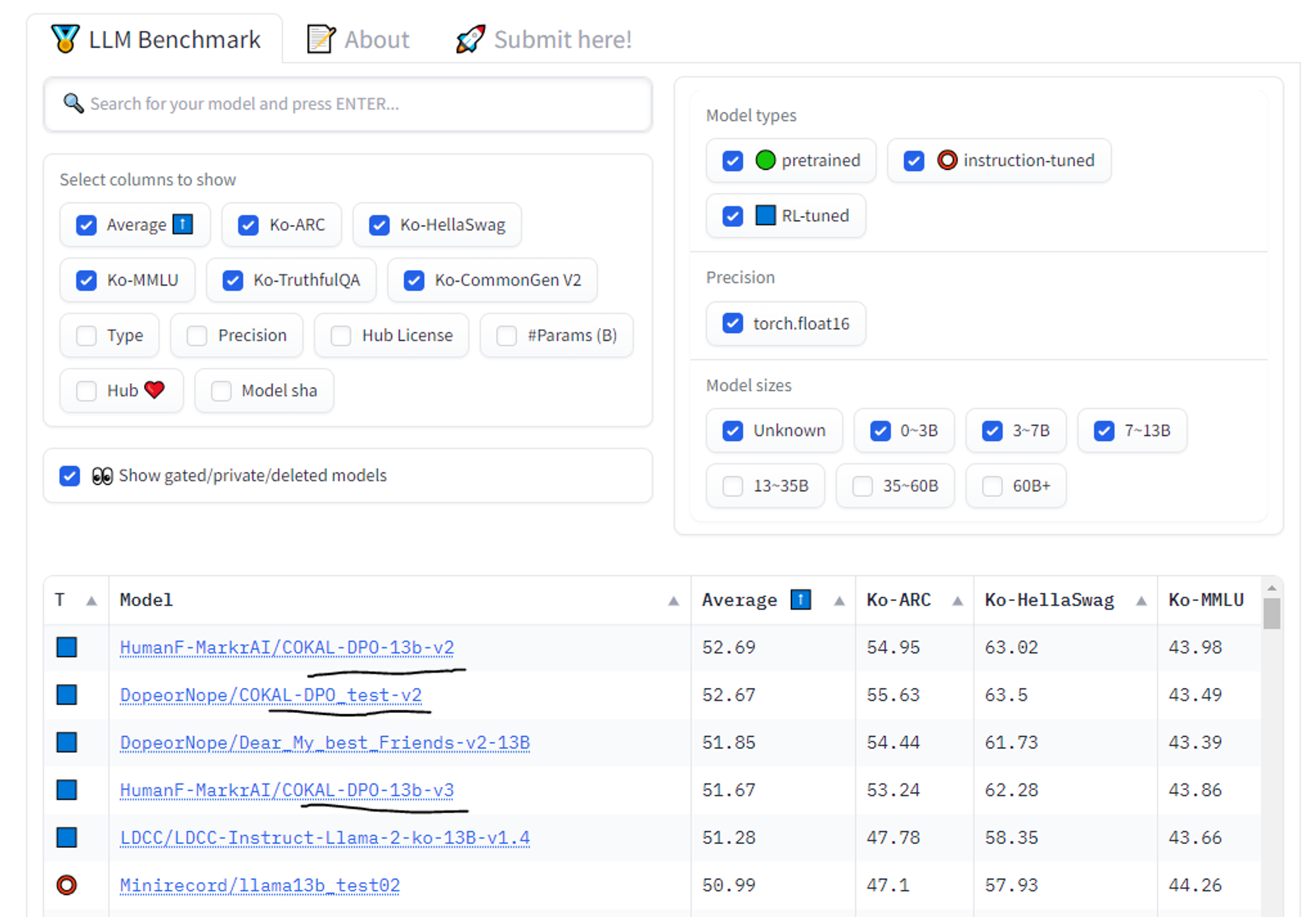 aihub에서 진행중인 LLM 성능 리더보드에서도 DPO 방법론을 활용한 모델의 성능이 상위권에 위치하는 것을 확인가능