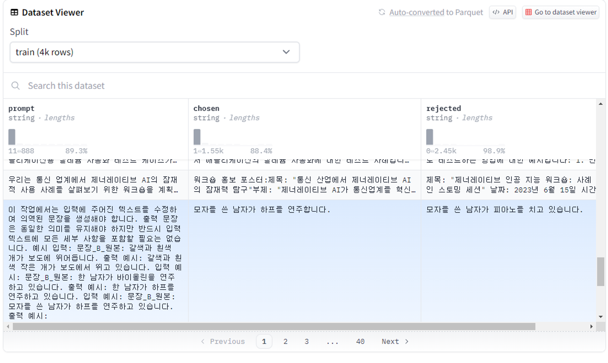 많이 채택하는 방식으로 (Prompt, Chosen Response, Reject Response) 의 형태로 데이터를 구성