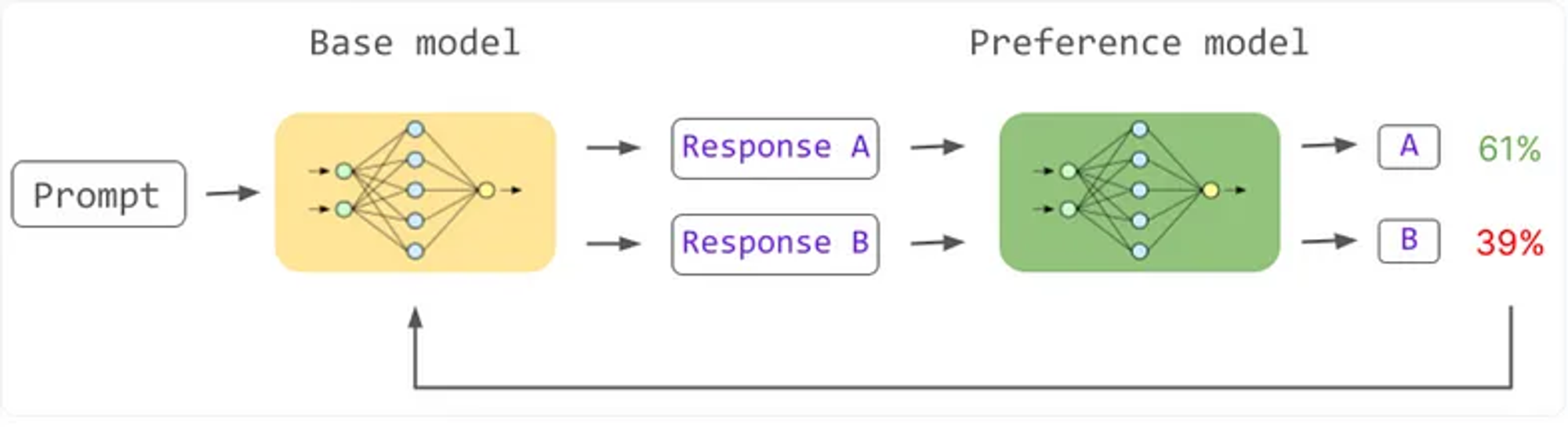 - SFT 모델에 추가적으로 사람의 피드백을 보상으로 한 강화 학습을 적용하여 사람의 의도에 부합하는 답변을 생성 하도록 하는 과정