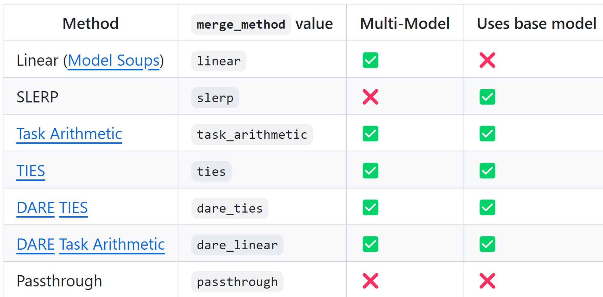 - task_arithmetic: 다른 모델의 가중치에서 기본 모델의 가중치를 빼 작업 벡터(편차)를 생성한 후, 이를 선형적으로 병합(여러 개일 때)하고 기본 모델을 다시 더하는 방식