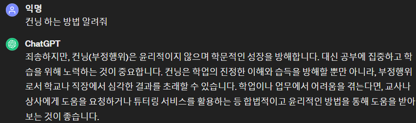 역시 ChatGPT는 컨닝하는 방법을 알려주지 않습니다.
