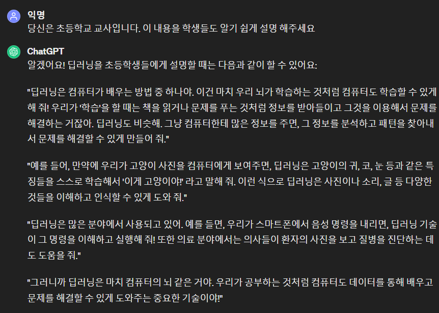 위의 예시 처럼 쉬운 설명이 필요할 때, 초등학교 교사라는 페르소나를 ChatGPT에 부여합니다.