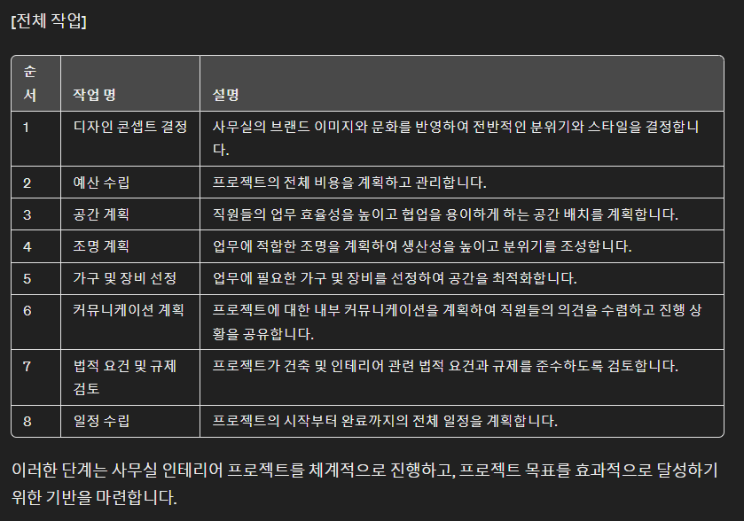 이렇게 저희 빅웨이브 팀은 사무실 인테리어 프로젝트 계획을 수립할 수 있었습니다.